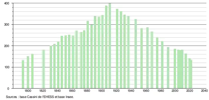 L'évolution du nombre d'habitants est connue à travers les recensements de la population effectués dans la commune depuis 1793. Pour les communes de moins de 10 000 habitants, une enquête de recensement portant sur toute la population est réalisée tous les cinq ans, les populations légales des années intermédiaires étant quant à elles estimées par interpolation ou extrapolation[25]. Pour la commune, le premier recensement exhaustif entrant dans le cadre du nouveau dispositif a été réalisé en 2004[26].