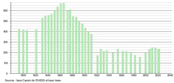 L'évolution du nombre d'habitants est connue à travers les recensements de la population effectués dans la commune depuis 1793. Pour les communes de moins de 10 000 habitants, une enquête de recensement portant sur toute la population est réalisée tous les cinq ans, les populations légales des années intermédiaires étant quant à elles estimées par interpolation ou extrapolation[31]. Pour la commune, le premier recensement exhaustif entrant dans le cadre du nouveau dispositif a été réalisé en 2005[32].