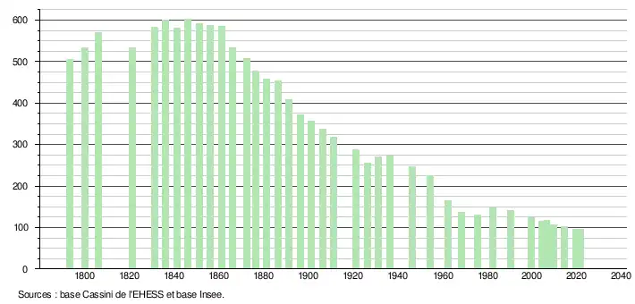 L'évolution du nombre d'habitants est connue à travers les recensements de la population effectués dans la commune depuis 1793. Pour les communes de moins de 10 000 habitants, une enquête de recensement portant sur toute la population est réalisée tous les cinq ans, les populations légales des années intermédiaires étant quant à elles estimées par interpolation ou extrapolation[14]. Pour la commune, le premier recensement exhaustif entrant dans le cadre du nouveau dispositif a été réalisé en 2004[15].