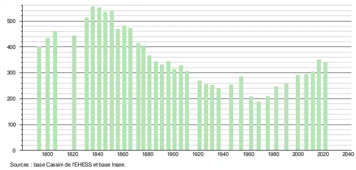 L'évolution du nombre d'habitants est connue à travers les recensements de la population effectués dans la commune depuis 1793. Pour les communes de moins de 10 000 habitants, une enquête de recensement portant sur toute la population est réalisée tous les cinq ans, les populations légales des années intermédiaires étant quant à elles estimées par interpolation ou extrapolation[18]. Pour la commune, le premier recensement exhaustif entrant dans le cadre du nouveau dispositif a été réalisé en 2006[19].