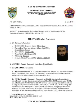 Le , le gouvernement rendit public le résultat du Combatant Status Review Tribunal (en) (procédure exorbitante du droit commun dans laquelle l'armée américaine examinait la légitimité des qualifications de « combattant ennemi ») concernant Majid. Dans ces comptes-rendus d'auditions, plusieurs témoins détenus à Guantanamo écartaient les charges portées contre Majid Khan par l'armée, tandis que ce dernier déclarait avoir été contraint aux aveux sous la torture, niait toute inculpation et se déclarait volontaire au détecteur de mensonge[1].