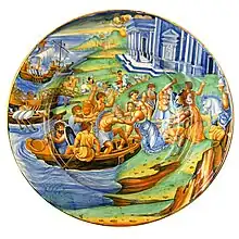 L'importation de la faïence stannifère[11] espagnole se fait après plusieurs siècles de domination des modèles hispano-mauresques. Les potiers italiens vont mettre à profit l'émail blanc de la faïence pour peindre de véritables tableaux en miniature qui bénéficieront de l'extraordinaire vitalité artistique de la Renaissance italienne. On voit apparaitre dans les décors, dès le début du XVIe siècle, les figures humaines qui supplantent peu à peu les motifs stylisés de la majolique archaïque du haut Moyen Âge. Ces scènes allégoriques rencontreront rapidement le goût du moment et les décors gagneront en finesse et en richesse jusqu'à recouvrir totalement le support blanc de la pâte à faïence.