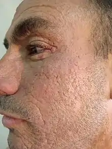 Les symptômes de la maladie varient grandement selon les individus. Ils peuvent inclure une voix rauque, des lésions et des cicatrices sur la peau, une peau facilement endommagée avec une mauvaise cicatrisation, une peau sèche et ridée et un perlage des papules autour des paupières[1],[2],[3]. Dans certains cas, on observe également un durcissement du tissu cérébral dans les lobes temporaux médians, ce qui peut entraîner de l'épilepsie et des anomalies neuropsychiatriques[4].