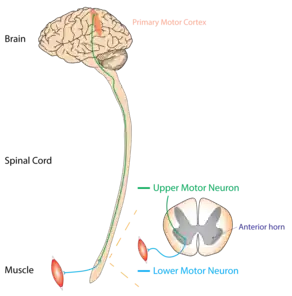Les UMN sont des motoneurones qui se projettent du cortex jusqu'au tronc cérébral ou à la moelle épinière[10]. Les LMN trouvent leur origine dans les cornes antérieures de la moelle épinière et se synaptisent sur les muscles périphériques. Les deux neurones moteurs sont nécessaires à la forte contraction d'un muscle, mais les dommages à un UMN peuvent être distingués des dommages à un LMN par un examen physique.