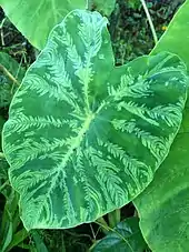 Symptômes de mosaïque plumeuse due au Dasheen mosaic virus sur feuille de taro.