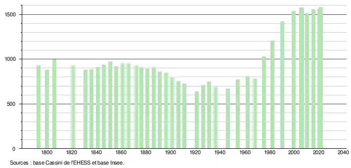 L'évolution du nombre d'habitants est connue à travers les recensements de la population effectués dans la commune depuis 1793. Pour les communes de moins de 10 000 habitants, une enquête de recensement portant sur toute la population est réalisée tous les cinq ans, les populations légales des années intermédiaires étant quant à elles estimées par interpolation ou extrapolation[31]. Pour la commune, le premier recensement exhaustif entrant dans le cadre du nouveau dispositif a été réalisé en 2005[32].