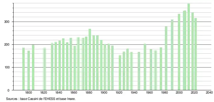 L'évolution du nombre d'habitants est connue à travers les recensements de la population effectués dans la commune depuis 1793. Pour les communes de moins de 10 000 habitants, une enquête de recensement portant sur toute la population est réalisée tous les cinq ans, les populations légales des années intermédiaires étant quant à elles estimées par interpolation ou extrapolation[19]. Pour la commune, le premier recensement exhaustif entrant dans le cadre du nouveau dispositif a été réalisé en 2007[20].