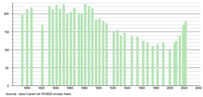 L'évolution du nombre d'habitants est connue à travers les recensements de la population effectués dans la commune depuis 1793. Pour les communes de moins de 10 000 habitants, une enquête de recensement portant sur toute la population est réalisée tous les cinq ans, les populations légales des années intermédiaires étant quant à elles estimées par interpolation ou extrapolation[18]. Pour la commune, le premier recensement exhaustif entrant dans le cadre du nouveau dispositif a été réalisé en 2008[19].