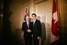 Le , Tony Abbott est mis en minorité par un vote des parlementaires de son propre parti, par 44 voix contre 54 à Turnbull, qui devient ainsi le nouveau chef des libéraux[7], et qui, le lendemain, est investi Premier ministre[8]. Deux différences majeures, outre son passé de militant républicain, séparent Turnbull de la ligne orthodoxe d'Abbott : son soutien au mariage homosexuel et à la lutte contre le changement climatique[9] (timoré lors de sa primature).