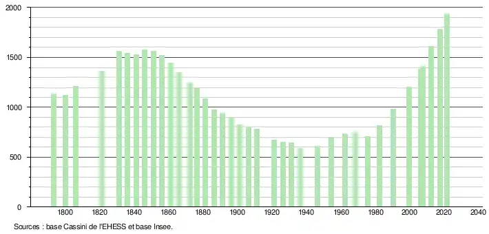 L'évolution du nombre d'habitants est connue à travers les recensements de la population effectués dans la commune depuis 1793. Pour les communes de moins de 10 000 habitants, une enquête de recensement portant sur toute la population est réalisée tous les cinq ans, les populations légales des années intermédiaires étant quant à elles estimées par interpolation ou extrapolation[22]. Pour la commune, le premier recensement exhaustif entrant dans le cadre du nouveau dispositif a été réalisé en 2007[23].