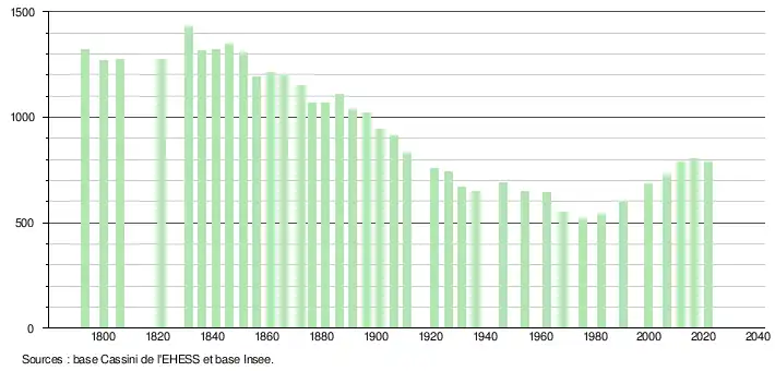 L'évolution du nombre d'habitants est connue à travers les recensements de la population effectués dans la commune depuis 1793. Pour les communes de moins de 10 000 habitants, une enquête de recensement portant sur toute la population est réalisée tous les cinq ans, les populations légales des années intermédiaires étant quant à elles estimées par interpolation ou extrapolation[23]. Pour la commune, le premier recensement exhaustif entrant dans le cadre du nouveau dispositif a été réalisé en 2006[24].
