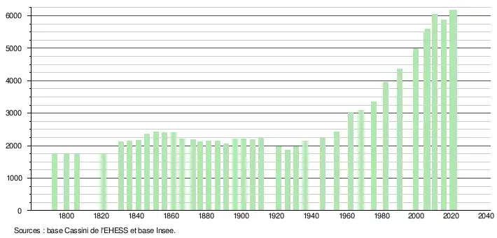 L'évolution du nombre d'habitants est connue à travers les recensements de la population effectués dans la commune depuis 1793. Pour les communes de moins de 10 000 habitants, une enquête de recensement portant sur toute la population est réalisée tous les cinq ans, les populations légales des années intermédiaires étant quant à elles estimées par interpolation ou extrapolation[23]. Pour la commune, le premier recensement exhaustif entrant dans le cadre du nouveau dispositif a été réalisé en 2005[24].