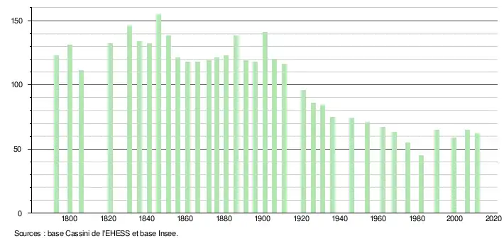 L'évolution du nombre d'habitants est connue à travers les recensements de la population effectués dans la commune depuis 1793. À partir du , les populations légales des communes sont publiées annuellement dans le cadre d'un recensement qui repose désormais sur une collecte d'information annuelle, concernant successivement tous les territoires communaux au cours d'une période de cinq ans. Pour les communes de moins de 10 000 habitants, une enquête de recensement portant sur toute la population est réalisée tous les cinq ans, les populations légales des années intermédiaires étant quant à elles estimées par interpolation ou extrapolation[3]. Pour la commune, le premier recensement exhaustif entrant dans le cadre du nouveau dispositif a été réalisé en 2006[4],[Note 1].