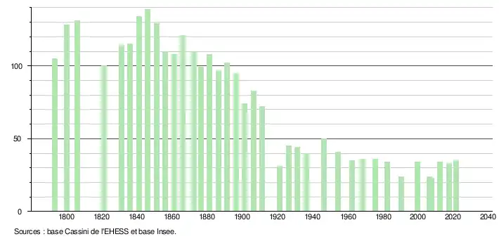L'évolution du nombre d'habitants est connue à travers les recensements de la population effectués dans la commune depuis 1793. Pour les communes de moins de 10 000 habitants, une enquête de recensement portant sur toute la population est réalisée tous les cinq ans, les populations légales des années intermédiaires étant quant à elles estimées par interpolation ou extrapolation[19]. Pour la commune, le premier recensement exhaustif entrant dans le cadre du nouveau dispositif a été réalisé en 2007[20].