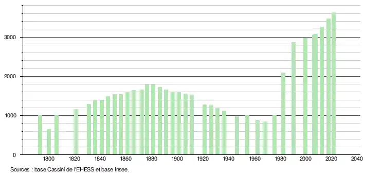 L'évolution du nombre d'habitants est connue à travers les recensements de la population effectués dans la commune depuis 1793. Pour les communes de moins de 10 000 habitants, une enquête de recensement portant sur toute la population est réalisée tous les cinq ans, les populations légales des années intermédiaires étant quant à elles estimées par interpolation ou extrapolation[27]. Pour la commune, le premier recensement exhaustif entrant dans le cadre du nouveau dispositif a été réalisé en 2007[28].