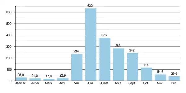 En ne considérant que la période estivale, libre de glaces (de juin à septembre inclus), le débit mensuel minimal observé a été de 128 m3/s en , ce qui restait plus que confortable.