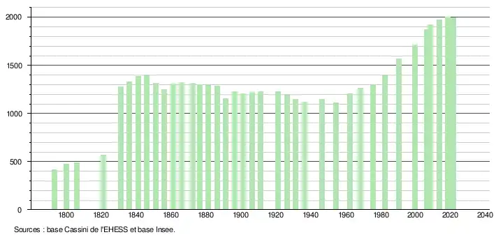 L'évolution du nombre d'habitants est connue à travers les recensements de la population effectués dans la commune depuis 1793. Pour les communes de moins de 10 000 habitants, une enquête de recensement portant sur toute la population est réalisée tous les cinq ans, les populations légales des années intermédiaires étant quant à elles estimées par interpolation ou extrapolation[31]. Pour la commune, le premier recensement exhaustif entrant dans le cadre du nouveau dispositif a été réalisé en 2008[32].
