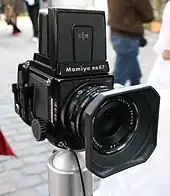 Le Mamiya 645 Super, ici dans sa configuration basique, appareil photographique SLR moyen format commercialisé de décembre 1985 à 1993. | |