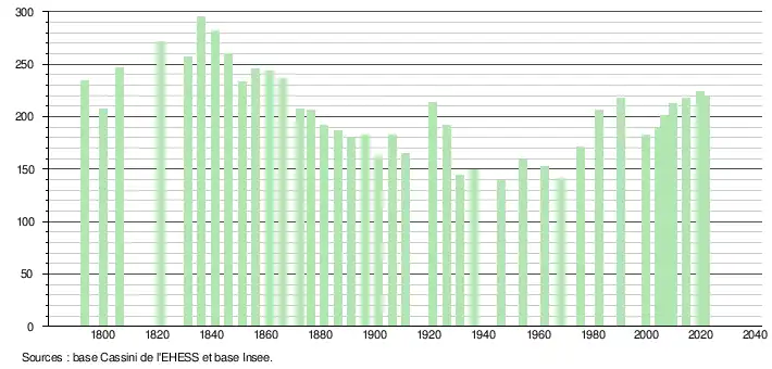 L'évolution du nombre d'habitants est connue à travers les recensements de la population effectués dans la commune depuis 1793. Pour les communes de moins de 10 000 habitants, une enquête de recensement portant sur toute la population est réalisée tous les cinq ans, les populations légales des années intermédiaires étant quant à elles estimées par interpolation ou extrapolation[21]. Pour la commune, le premier recensement exhaustif entrant dans le cadre du nouveau dispositif a été réalisé en 2004[22].
