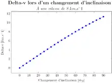Un changement d’inclinaison nécessite qu’une seule impulsion, et modifie seulement l’inclinaison de l’orbite du véhicule spatial. Lors d’une manœuvre de changement d’inclinaison le delta-v nécessaire est égal à :