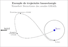 L’illustration ci-contre représente l’une des trajectoires des sondes GRAIL dans le référentiel géocentré tournant dans lequel le Soleil est fixe. La seconde sonde a suivi une trajectoire différente, mais très proche de celle-ci, afin d’être en bonne position pour la mission. Les sondes GRAIL ont rejoint la Lune en 4 mois alors que les missions Apollo ne mettaient que 3 jours[6].
