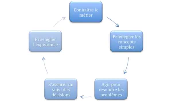 Les dirigeants qui connaissent leurs métiers, qui mettent véritablement la main à la pâte parviennent à ne pas être dupes des beaux discours. Le langage direct et les concepts simples débouchent plus facilement sur des actes. En connaissant véritablement le travail de ses employés, le dirigeant réussit à proposer des moyens pour surmonter les obstacles rencontrés et à s’assurer que ses décisions sont véritablement suivies d’un effet. Enfin, le dirigeant privilégie l’expérience et invite ses employés à prendre l’initiative d’apporter des améliorations plutôt que de se lamenter.