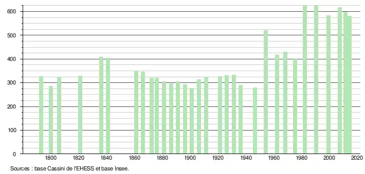 L'évolution du nombre d'habitants est connue à travers les recensements de la population effectués dans la commune depuis 1793. À partir du , les populations légales des communes sont publiées annuellement dans le cadre d'un recensement qui repose désormais sur une collecte d'information annuelle, concernant successivement tous les territoires communaux au cours d'une période de cinq ans. Pour les communes de moins de 10 000 habitants, une enquête de recensement portant sur toute la population est réalisée tous les cinq ans, les populations légales des années intermédiaires étant quant à elles estimées par interpolation ou extrapolation[2]. Pour la commune, le premier recensement exhaustif entrant dans le cadre du nouveau dispositif a été réalisé en 2007[3],[Note 1].