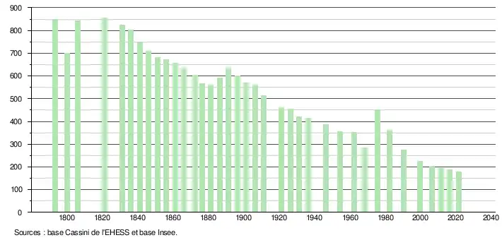 L'évolution du nombre d'habitants est connue à travers les recensements de la population effectués dans la commune depuis 1793. Pour les communes de moins de 10 000 habitants, une enquête de recensement portant sur toute la population est réalisée tous les cinq ans, les populations légales des années intermédiaires étant quant à elles estimées par interpolation ou extrapolation[19]. Pour la commune, le premier recensement exhaustif entrant dans le cadre du nouveau dispositif a été réalisé en 2006[20].
