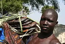 Un pêcheur Mandari portant du poisson fumé à Terekeka, Équatoria-Central