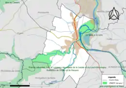 L'occupation des sols de la commune, telle qu'elle ressort de la base de données européenne d’occupation biophysique des sols Corine Land Cover (CLC), est marquée par l'importance des territoires agricoles (61,1 % en 2018), une proportion sensiblement équivalente à celle de 1990 (61,9 %). La répartition détaillée en 2018 est la suivante : zones agricoles hétérogènes (47 %), forêts (27,2 %), prairies (14,1 %), zones urbanisées (11,7 %)[28]. L'évolution de l’occupation des sols de la commune et de ses infrastructures peut être observée sur les différentes représentations cartographiques du territoire : la carte de Cassini (XVIIIe siècle), la carte d'état-major (1820-1866) et les cartes ou photos aériennes de l'IGN pour la période actuelle (1950 à aujourd'hui)[Carte 2].