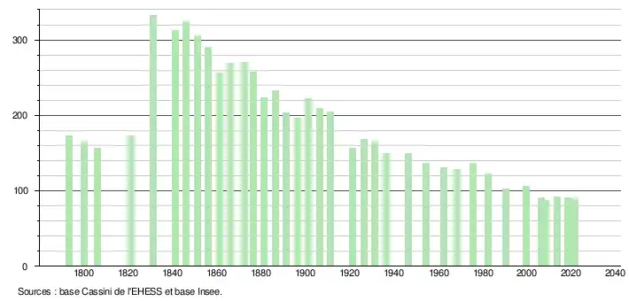 L'évolution du nombre d'habitants est connue à travers les recensements de la population effectués dans la commune depuis 1793. Pour les communes de moins de 10 000 habitants, une enquête de recensement portant sur toute la population est réalisée tous les cinq ans, les populations légales des années intermédiaires étant quant à elles estimées par interpolation ou extrapolation[24]. Pour la commune, le premier recensement exhaustif entrant dans le cadre du nouveau dispositif a été réalisé en 2008[25].