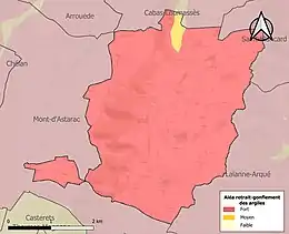 Le retrait-gonflement des sols argileux est susceptible d'engendrer des dommages importants aux bâtiments en cas d’alternance de périodes de sécheresse et de pluie. La totalité de la commune est en aléa moyen ou fort (94,5 % au niveau départemental et 48,5 % au niveau national). Sur les 56 bâtiments dénombrés sur la commune en 2019, 56 sont en aléa moyen ou fort, soit 100 %, à comparer aux 93 % au niveau départemental et 54 % au niveau national. Une cartographie de l'exposition du territoire national au retrait gonflement des sols argileux est disponible sur le site du BRGM[21],[Carte 3].