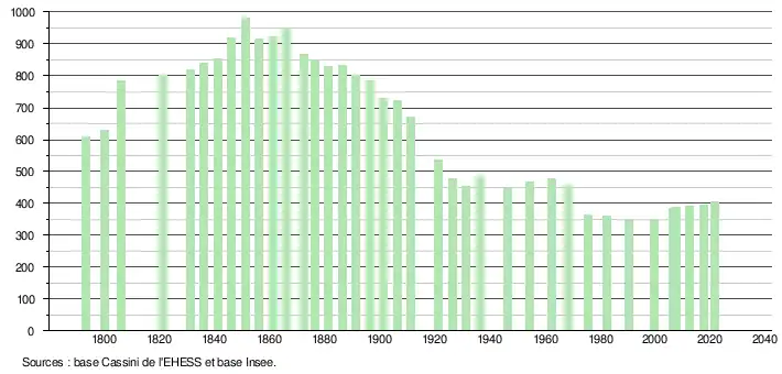 L'évolution du nombre d'habitants est connue à travers les recensements de la population effectués dans la commune depuis 1793. Pour les communes de moins de 10 000 habitants, une enquête de recensement portant sur toute la population est réalisée tous les cinq ans, les populations légales des années intermédiaires étant quant à elles estimées par interpolation ou extrapolation[34]. Pour la commune, le premier recensement exhaustif entrant dans le cadre du nouveau dispositif a été réalisé en 2007[35].