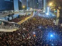La circulation des manifestants était très lente à cause des rues surpeuplées. Les derniers manifestants ne sont arrivés au complexe du conseil législatif que vers 22 h. L'heure officielle de la fin de la manifestation, à partir de laquelle celle-ci ne serait plus permise, était fixée à 23 h 59. Cependant, quelques manifestants restèrent à l'extérieur du conseil législatif après l'expiration du permis, des conflits avec la police se déclenchèrent.