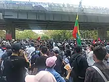 Le , un groupe d’instigateurs pro-militaires est arrivé sur un site de manifestation à Rangoun à bord de 15 véhicules banalisés, cherchant à provoquer la violence. Beaucoup ont brandi de grands clubs en bois et étaient autrement impossibles à distinguer des manifestants pro-démocratie.