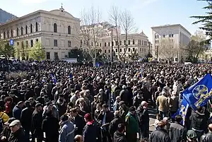 Les manifestations géorgiennes de 2009 font référence à un rassemblement de masse d'une coalition de partis d'opposition en Géorgie contre le gouvernement du président Mikheil Saakachvili. Des milliers de personnes ont manifesté, principalement dans la capitale Tbilissi, à partir du 9 avril 2009, en réclamant la démission de Saakachvili[1]. Le premier jour des manifestations, jusqu'à 60 000 personnes se sont rassemblées à Tbilissi[2]. Les militants de l'opposition attendaient entre 100 000 et 150 000 participants[3],[4]. Les manifestations se sont poursuivies pendant plus de trois mois, bien que moins de personnes y aient participé avec le temps. Le 26 mai 2009, jour de l'indépendance (en) de la Géorgie, 50 000 manifestants y ont pris part[5]. Bien que pacifiques au début, il y a eu des affrontements entre la police géorgienne et les manifestants[6],[7]. Les rassemblements quotidiens ont progressivement diminué et se sont terminés, sans aboutir à des résultats tangibles, le 24 juillet soit 107 jours après leur coup d'envoi[8].