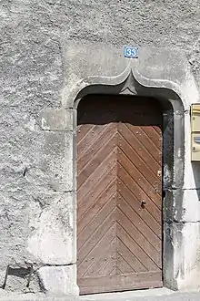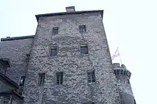 Mais le contrôle de l’accès à Moûtiers, par le nord, oblige Aigueblanche à se fortifier. Une maison forte est érigée, à la fin du XIIIe siècle[note 1],[6], et le bourg fortifié ; un village de maisons construites en tuf, remplace les vieilles cabanes en bois, et, se retranche derrière de robustes murailles dont quelques vestiges sont encore visibles aujourd’hui.