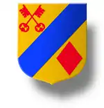 Blasonnement : « d'or à la barre d'azur, accompagnée en chef de 2 clefs de gueules passées en sautoir, et en pointe d'une losange du même »[50]