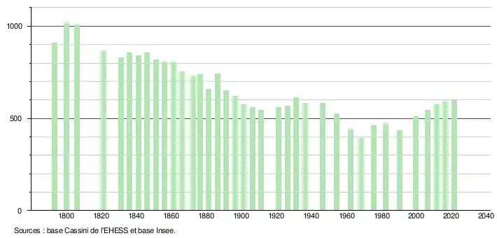 L'évolution du nombre d'habitants est connue à travers les recensements de la population effectués dans la commune depuis 1793. Pour les communes de moins de 10 000 habitants, une enquête de recensement portant sur toute la population est réalisée tous les cinq ans, les populations légales des années intermédiaires étant quant à elles estimées par interpolation ou extrapolation[19]. Pour la commune, le premier recensement exhaustif entrant dans le cadre du nouveau dispositif a été réalisé en 2006[20].