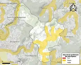 Le retrait-gonflement des sols argileux est susceptible d'engendrer des dommages importants aux bâtiments en cas d’alternance de périodes de sécheresse et de pluie. 29,3 % de la superficie communale est en aléa moyen ou fort (33,6 % au niveau départemental et 48,5 % au niveau national). Sur les 65 bâtiments dénombrés sur la commune en 2019, 16 sont en aléa moyen ou fort, soit 25 %, à comparer aux 25 % au niveau départemental et 54 % au niveau national. Une cartographie de l'exposition du territoire national au retrait gonflement des sols argileux est disponible sur le site du BRGM[16],[Carte 2].