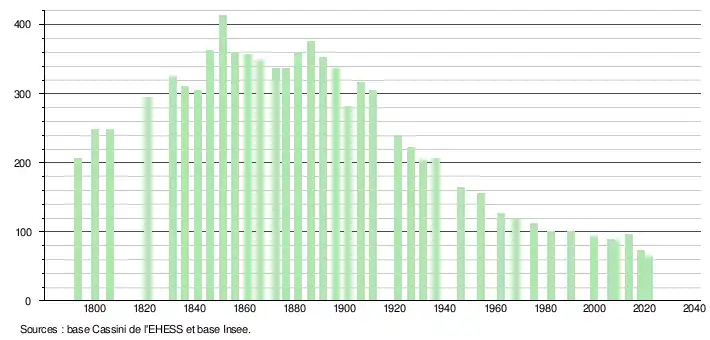 L'évolution du nombre d'habitants est connue à travers les recensements de la population effectués dans la commune depuis 1793. Pour les communes de moins de 10 000 habitants, une enquête de recensement portant sur toute la population est réalisée tous les cinq ans, les populations légales des années intermédiaires étant quant à elles estimées par interpolation ou extrapolation[24]. Pour la commune, le premier recensement exhaustif entrant dans le cadre du nouveau dispositif a été réalisé en 2008[25].