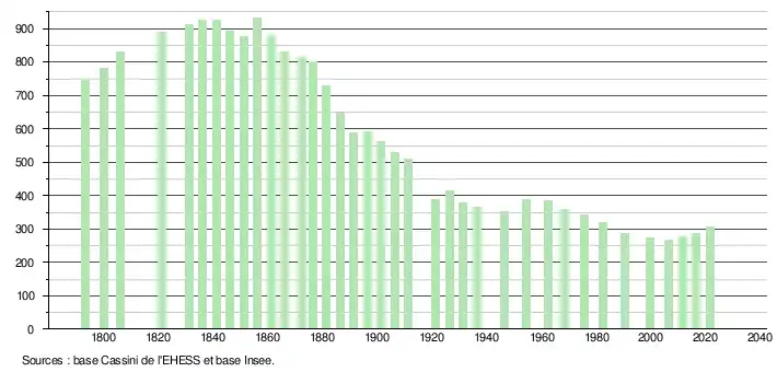 L'évolution du nombre d'habitants est connue à travers les recensements de la population effectués dans la commune depuis 1793. Pour les communes de moins de 10 000 habitants, une enquête de recensement portant sur toute la population est réalisée tous les cinq ans, les populations légales des années intermédiaires étant quant à elles estimées par interpolation ou extrapolation[29]. Pour la commune, le premier recensement exhaustif entrant dans le cadre du nouveau dispositif a été réalisé en 2006[30].