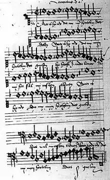 Parmi les chansons néerlandaises, on trouve un quodlibet, Mijn morken gaf mij een jonck wijff (Ma petite mère m’a donné une jeune femme), qui cite les premières lignes de plusieurs chansons polyphoniques célèbres : Adieu natuerlic leven mijn (Adieu, ma vie terrestre), Tandernaken op den Rijn (À Andernach, sur le Rhin), In mijnen zin haddic vercooren (Pour ma jouissance, j’avais choisi), and Het soude een meisken gaen om wijn (Une fille alla chercher du vin)[12]. Les paroles de Ryck God, nu moet ic trueren (Dieu miséricordieux, je dois me lamenter) semblent avoir été écrites par Matthijs de Castelein, car on les retrouve dans son recueil Diversche Liedekens (Différentes chansons), paru à titre posthume en 1573[13].