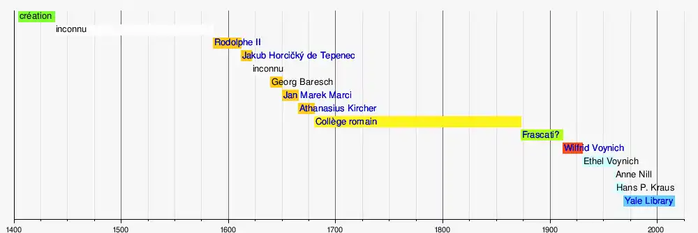 La chronologie des possesseurs du manuscrit Voynich figure ci-dessous. Les propriétaires communément acceptés du XVIIe siècle sont indiqués en orange ; la longue période où il se trouve au Collège romain est indiquée en jaune ; l'endroit où Wilfrid Voynich aurait acquis le manuscrit (à Frascati) est indiqué en vert ; Voynich est montré en rouge ; enfin les propriétaires modernes sont représentés en bleu. Les périodes inconnues sont indiquées en blanc et le moment où il a probablement été créé en vert, en fonction de la datation du vélin.