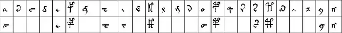 Des espacements plus larges divisent le texte en 37 919 mots, de taille variable. Il semble que le texte suive des règles phonétiques ou orthographiques : certains caractères doivent apparaître dans chaque mot (à l'instar des voyelles en français), certains caractères n'en suivent jamais d'autres, d'autres peuvent apparaître en double.