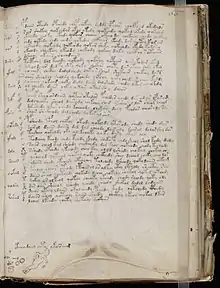 Une des pages du manuscrit avec ses dessins et ses textes énigmatiques. | |