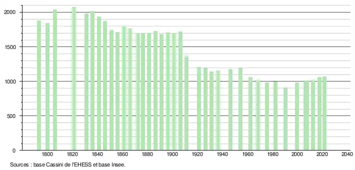 L'évolution du nombre d'habitants est connue à travers les recensements de la population effectués dans la commune depuis 1793. Pour les communes de moins de 10 000 habitants, une enquête de recensement portant sur toute la population est réalisée tous les cinq ans, les populations légales des années intermédiaires étant quant à elles estimées par interpolation ou extrapolation[26]. Pour la commune, le premier recensement exhaustif entrant dans le cadre du nouveau dispositif a été réalisé en 2007[27].