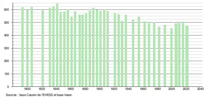 | L'évolution du nombre d'habitants est connue à travers les recensements de la population effectués dans la commune depuis 1793. Pour les communes de moins de 10 000 habitants, une enquête de recensement portant sur toute la population est réalisée tous les cinq ans, les populations légales des années intermédiaires étant quant à elles estimées par interpolation ou extrapolation[24]. Pour la commune, le premier recensement exhaustif entrant dans le cadre du nouveau dispositif a été réalisé en 2005[25]. En 2021, la commune comptait 473 habitants[Note 4], en diminution de 6,52 % par rapport à 2015 (Eure : −0,5 %, France hors Mayotte : +1,84 %). |