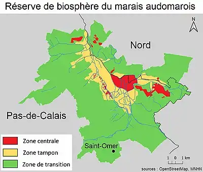 Carte du zonage de la réserve de biosphère du marais audomarois