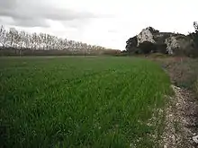 Vue sur le marais des Baux depuis le rocher de Linsolat (altitude 21 mètres). À l'arrière-plan, les rochers de la Pène et, au fond, le massif des Alpilles. | ||